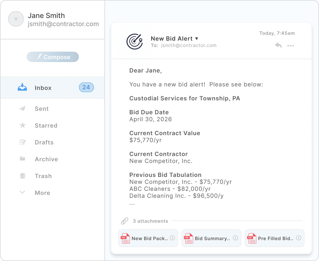 LocalBidRadar alerts you to new municipal bid opportunities and starts the paperwork so you can focus on winning the job.