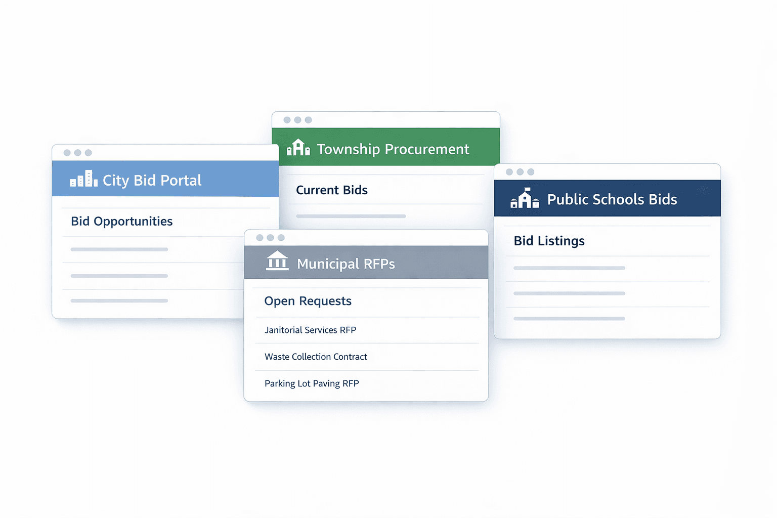 Municipalities, cities, and school districts all publish bid opportunities on separate procurement pages.